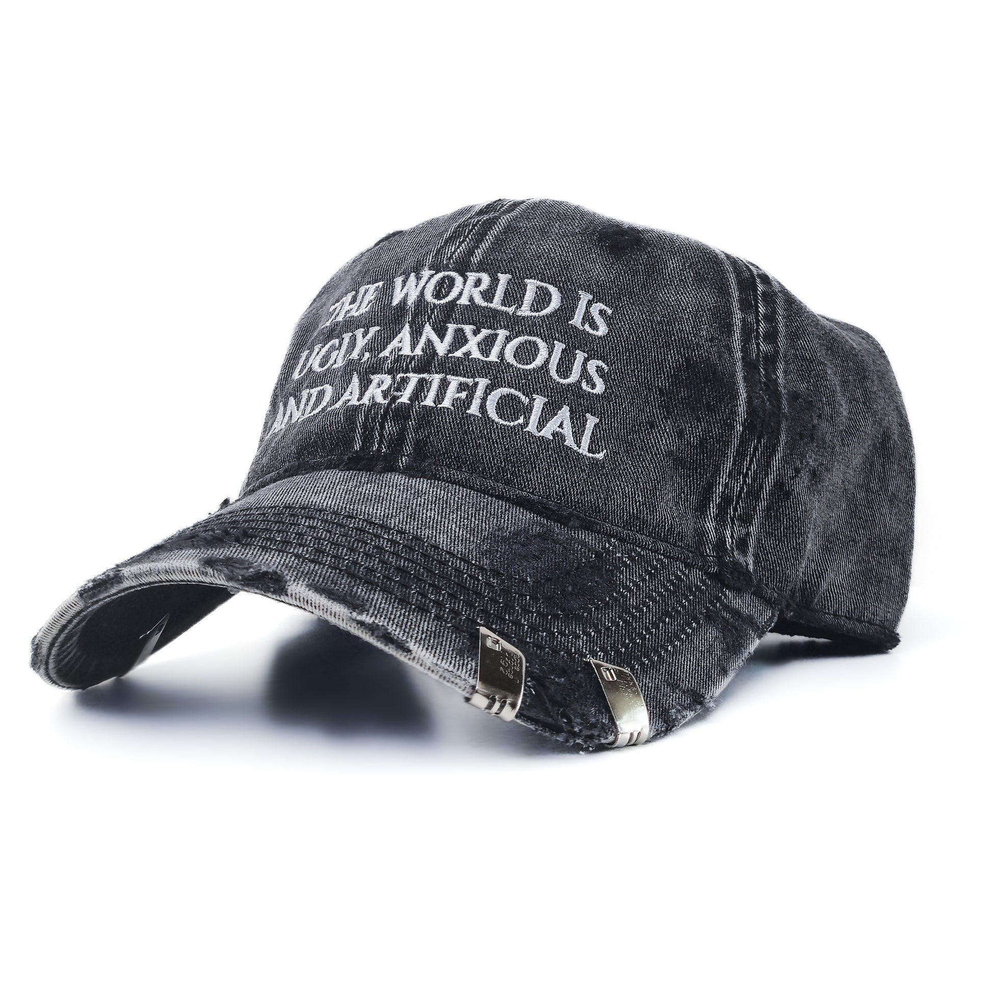 Front "THE WORLD IS UGLY, ANXIOUS AND ARTIFICIAL " embroidery in WHITE